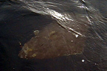 När vi fiskade vid Brunoyboan så tyckte vi övriga att det var dags för fika. Men Micke hade fått på en av otaliga småsejar på sin svenskepilk och lät den sitta kvar då vi gled av toppen och ut mot djupare vatten. Då känner han hur något fattar tycke för sejen och när mothugget sitter så är det något riktigt stort som sitter fast i andra änden. Efter en 45 minuters dragkamp kommer en jätteflundra upp till ytan och tittar på båten innan den väljer att dyka ner 30 meter igen. Efter ytterligare 15 minuter ligger flundran återigen vid båten. Frågan vi ställde oss var hur vi skulle hantera flundran? Dessa stora flundror är inte någon delikatess på matbordet så man vill helst släppa tillbaka dem igen. Men genom att mäta flundran så kan man få en ungefärlig vikt enligt tabell. Men vi hade ingen ordentlig utrustning i båten så att vi kunde klara att lägga en snara runt stjärtspolen och säkra flundran ordentligt. Tyvärr klarade vi inte att få någon exakt längd på flundran innan den simmade tillbaka ner i djupet igen. Men längden låg någonstans mellan 160-170 cm alltså en vikt på mellan 60-70 kilo! Uppenbarligen finns de stora flundrorna i detta område vilket vi nästa dag återigen fick erfara.
